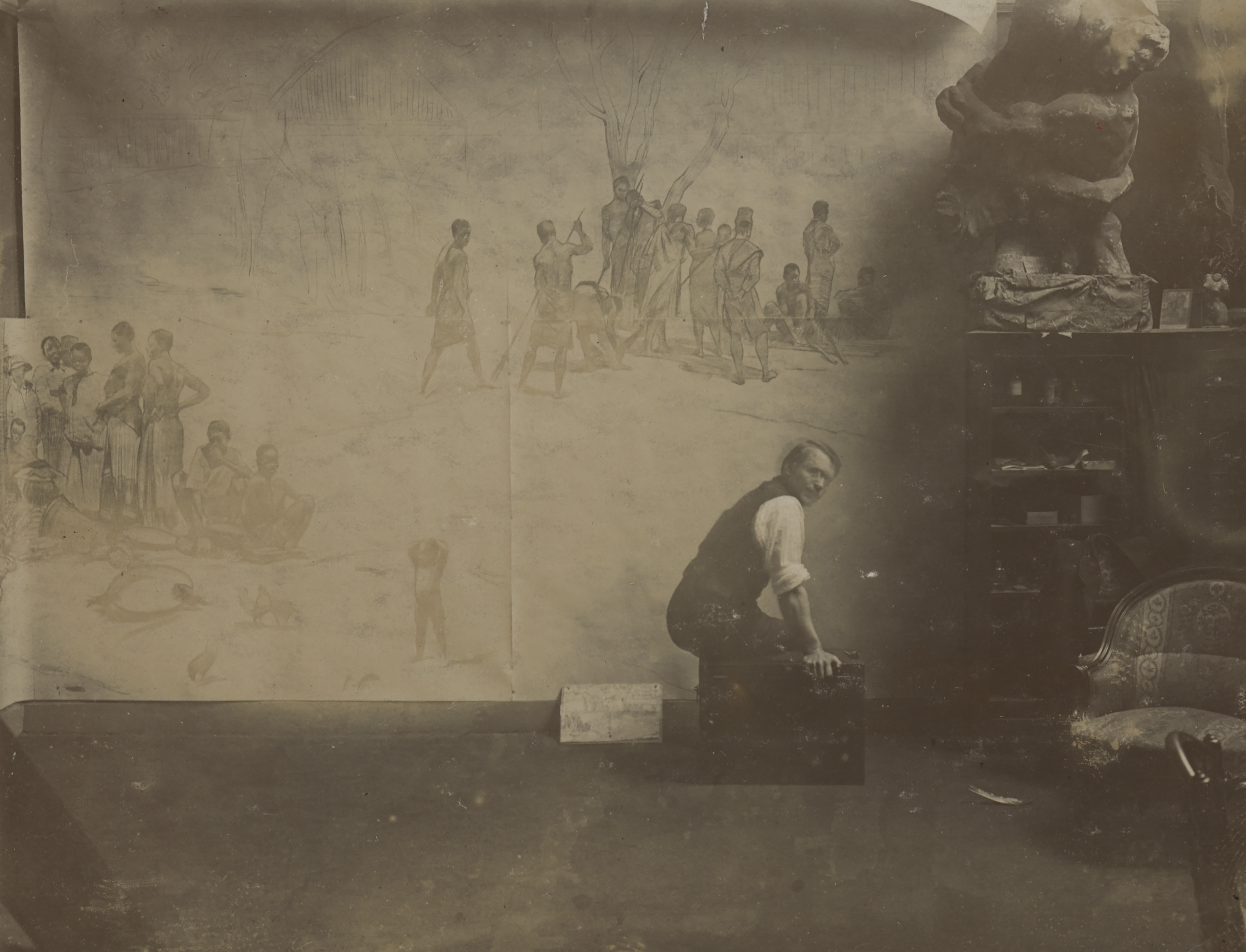 In 1911, the Belgian Minister of Colonies, Jules Renkin, commissioned the Panorama from the Belgian painters Paul Mathieu (1872-1932) and Alfred Bastien 1873-1955). These painters were well known participants of the Salons – or public art exhibitions – but it was the first time they had worked on such a large scale. To prepare for this task they undertook an eight-week mission to Congo, sponsored by the recently established Artistic Mission Travel Bursary program of the Ministry of Colonies. During this trip, they travelled to different parts of Congo and made numerous sketches, study paintings and photographs.